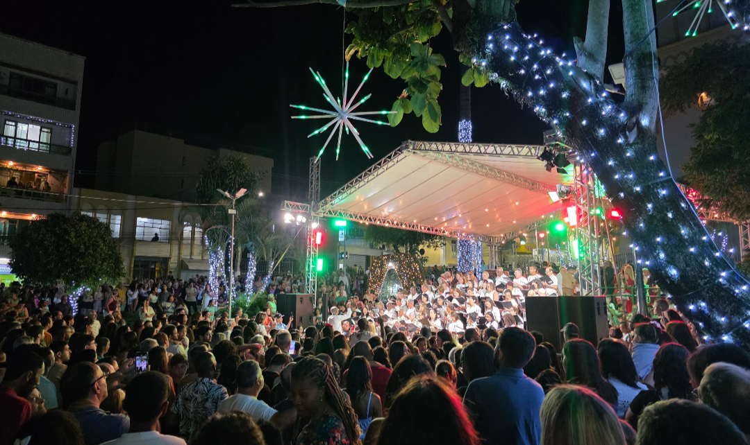 A Praça Cesário Alvim, no Centro da cidade, sediou uma Cantata de Natal que marcou a inauguração da decoração que ilumina a terra do Pai da Aviação, na Zona da Mata mineira