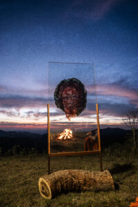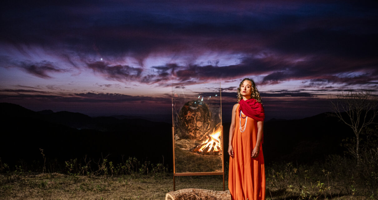 A escolha do vidro como suporte central da pintura é também conceitual. Transparência, suspensão e deslocamento atravessam a trajetória da artista, que transita entre artes visuais e cênicas. Ao pintar com tinta gráfica e óleo sobre vidro, a imagem se torna instável. O solvente turva, dilata e cria camadas. De longe, vê-se o retrato; de perto, emergem micro-narrativas abstratas. A matéria ecoa a própria ideia de memória. Entre os trabalhos apresentados, destaca-se a instalação Ara pyau, termo em guarani que significa tempo novo. A obra reúne sete gerações em torno de uma fogueira, gesto que será retomado na performance de abertura, marcada para às 20h do dia 17 de março, com interpretação em LIBRAS. A data coincide com os 90 anos do encantamento de Maria Rita, falecida em 17 de março de 1936.
