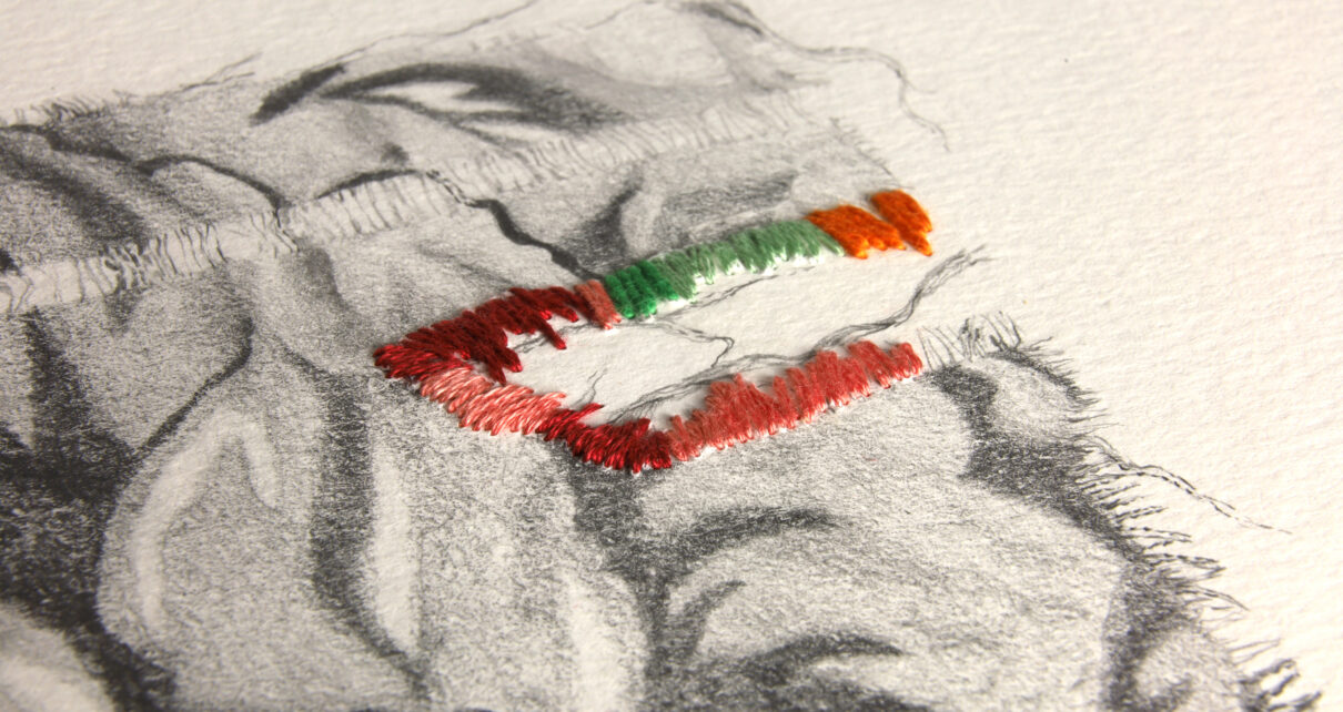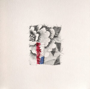 Ao desfazer, fotografar, desenhar e bordar seus fragmentos, Rita de Souza desloca esse universo para o campo do desenho, onde as cores se insinuam e as formas se reorganizam em composições mais contidas, mas ainda carregadas de intensidade. Nesse processo, o gesto manual ganha protagonismo. Sobrepor fios deixa de ser apenas um procedimento técnico e passa a estruturar o pensamento da obra. As imagens resultam de um equilíbrio entre controle e espontaneidade, em que o que foi rompido não é simplesmente restaurado, mas transformado em outra forma de presença.